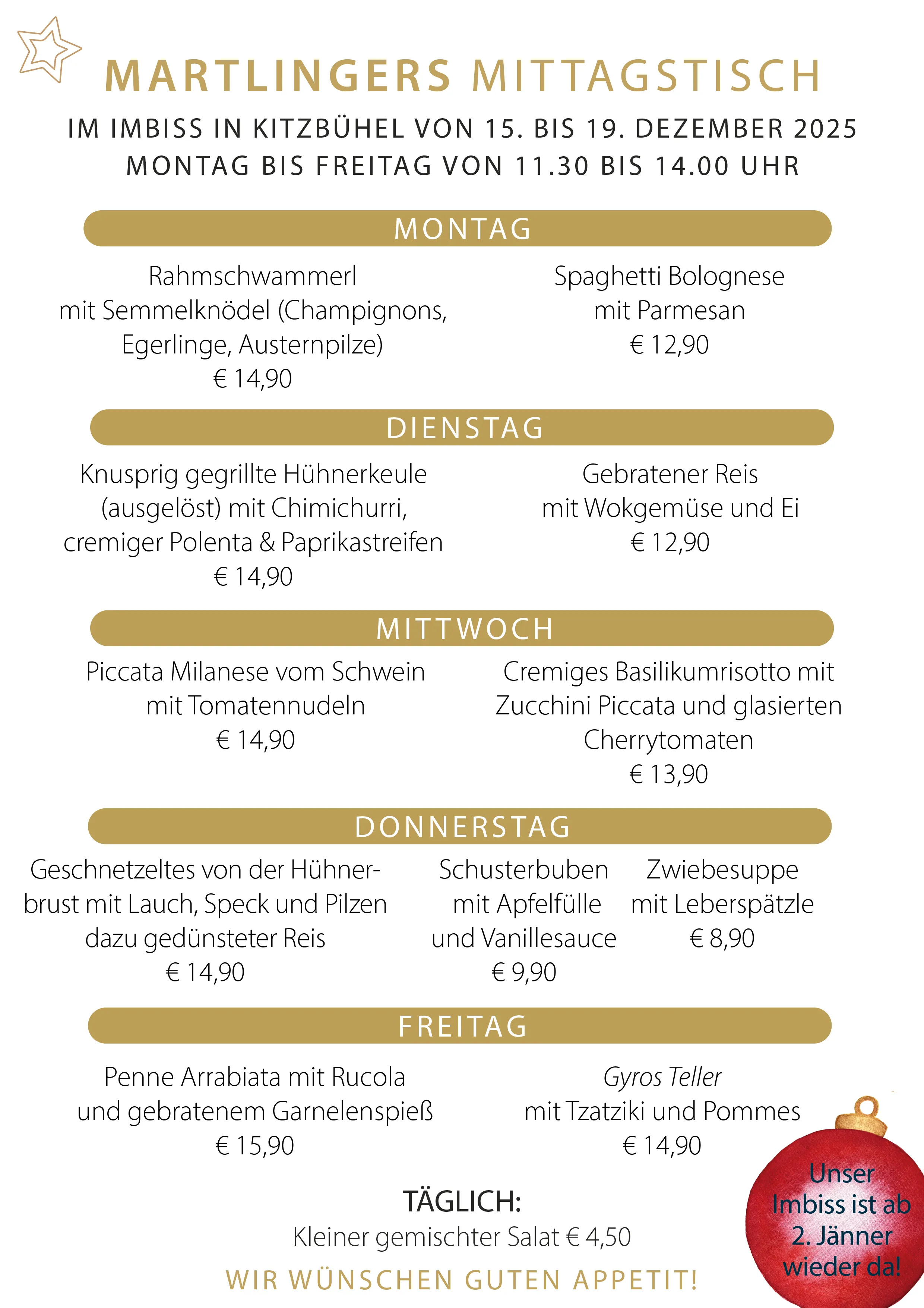 Mittwoch, 24. Dezember 2025: 08.00 - 13.00 Uhr