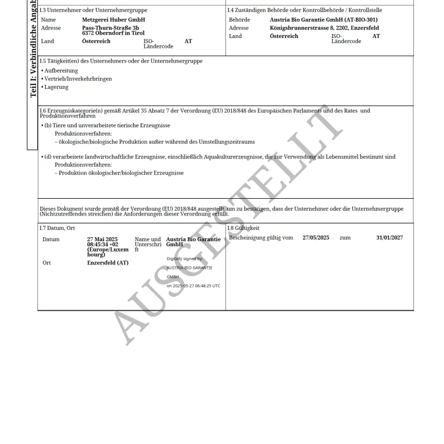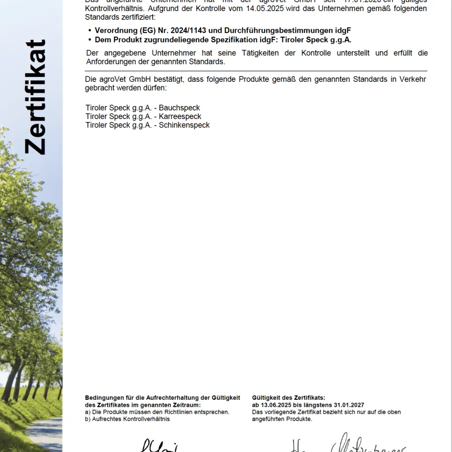 Die Metzgerei Huber ist nicht nur wichtiger Lieferant für die heimische Gastronomie, sondern auch den österreichischen und deutschen Lebensmitteleinzelhandel. Mehrmals im Jahr unterziehen wir uns im Rahmen von verschiedenen Audits strengen Qualitätskontrollen und stellen unsere Hygienerichtlinien auf die Probe. Unsere aktuellen Zertifikate finden Sie hier zum Download. Bei Fragen stehen wir Ihnen gerne zur Verfügung!